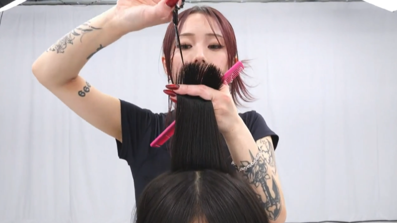 チョップカットで隙間を作ってから、必要最小限のセニングで整える順番が重要です。