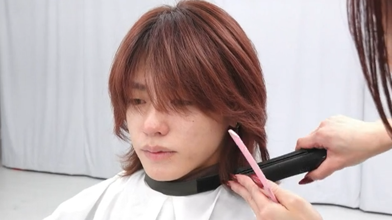 前髪の根元は1cm幅の細かい操作で「浮遊感」を作り、曲げすぎないナチュラルな曲線に仕上げます。