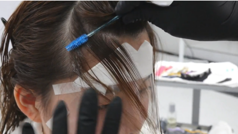 まず、1液を流した後に前髪が下りている。