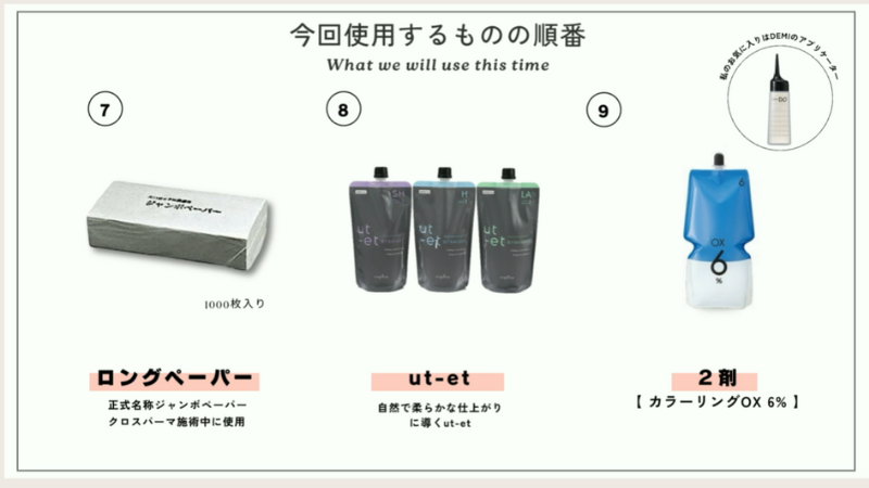 クロスパーマに使うアイテムと使用順番は以下のとおりです。