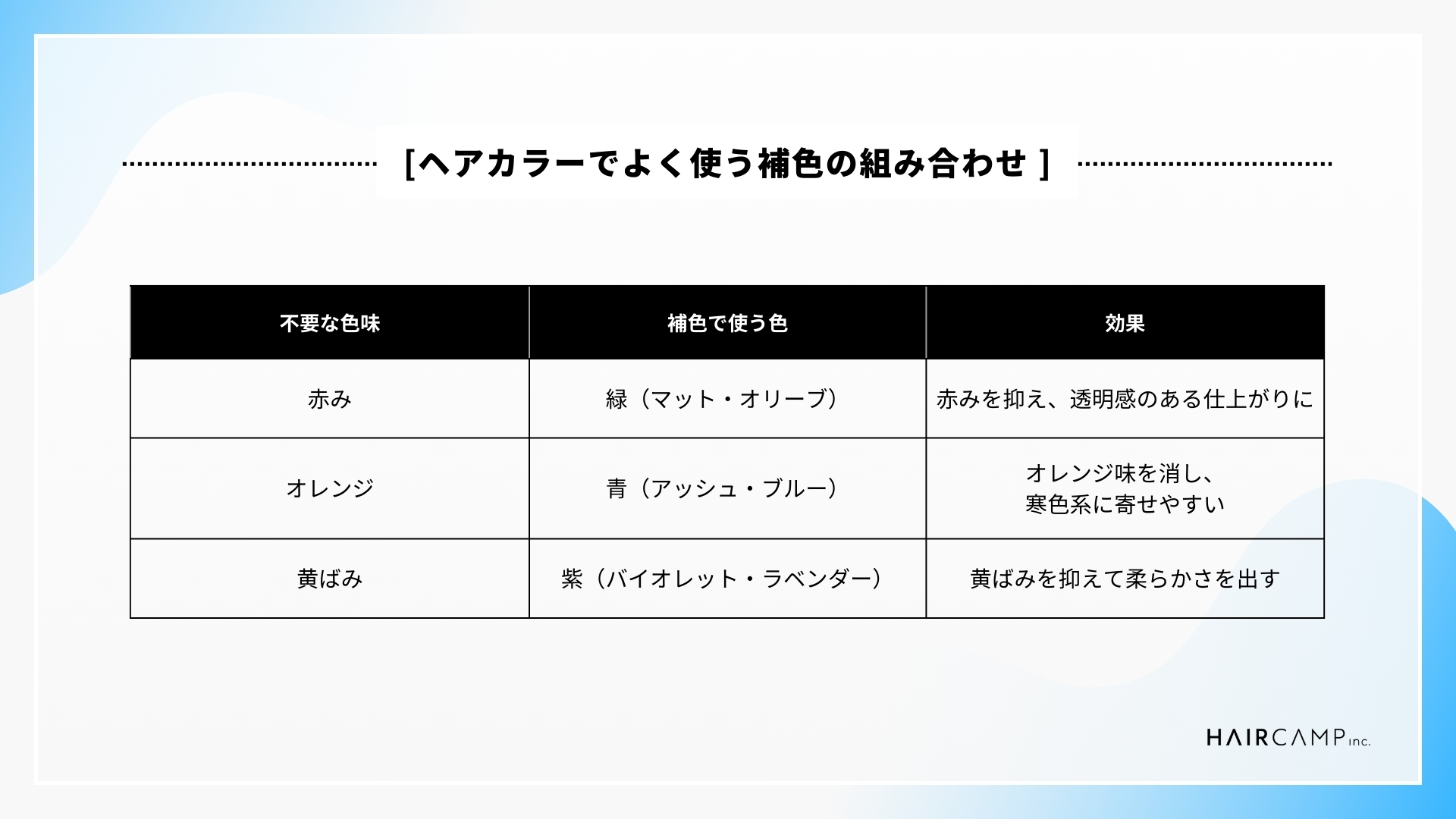 ヘアカラーでよく使う補色の組み合わせは以下の通りです。