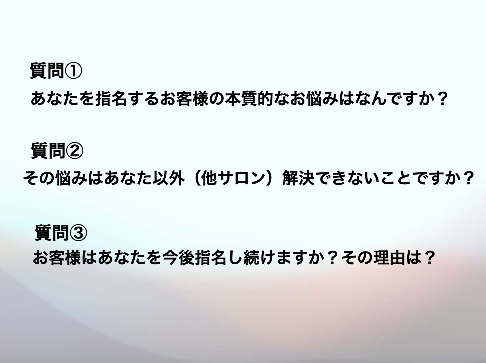 スタッフに「明日から指名料2,000円上げられますか?」と問い、自身の価値提供能力を見つめ直させます。