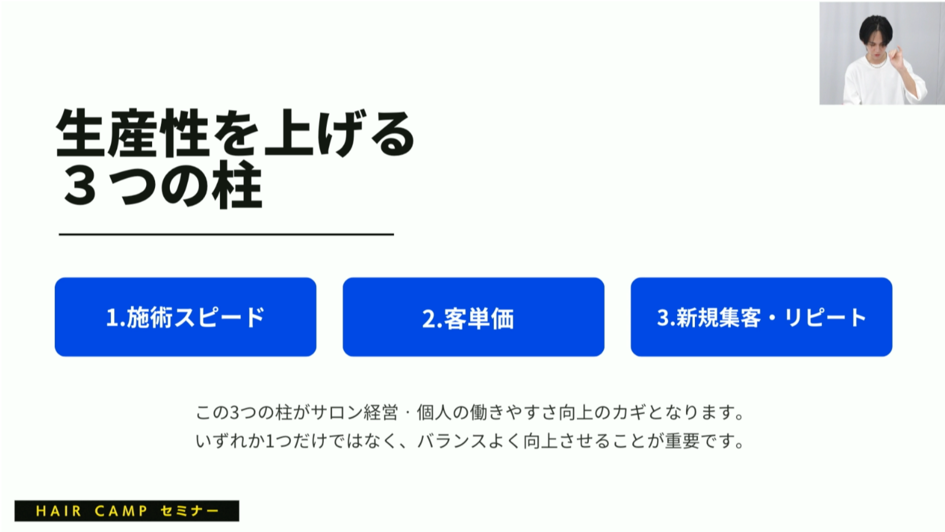「生産性UPはスピード・客単価・集客の3本柱がバランス良く揃ってこそ」。
