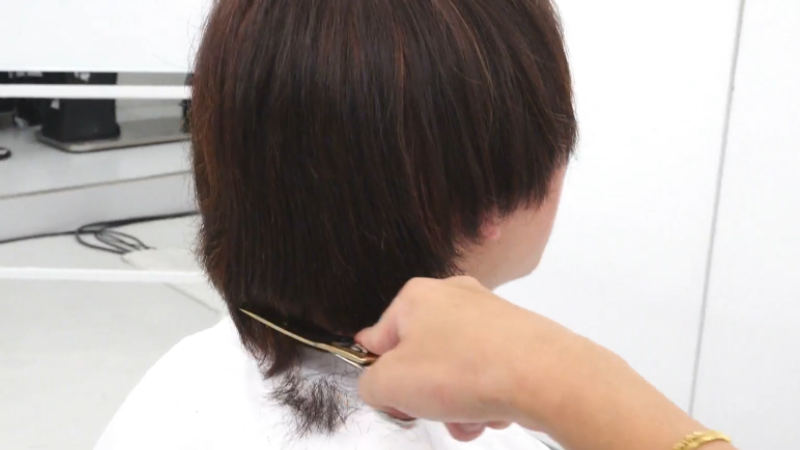 多くのスタイリストが前髪から始めるのに対し、松本先生は襟足からスタートします。