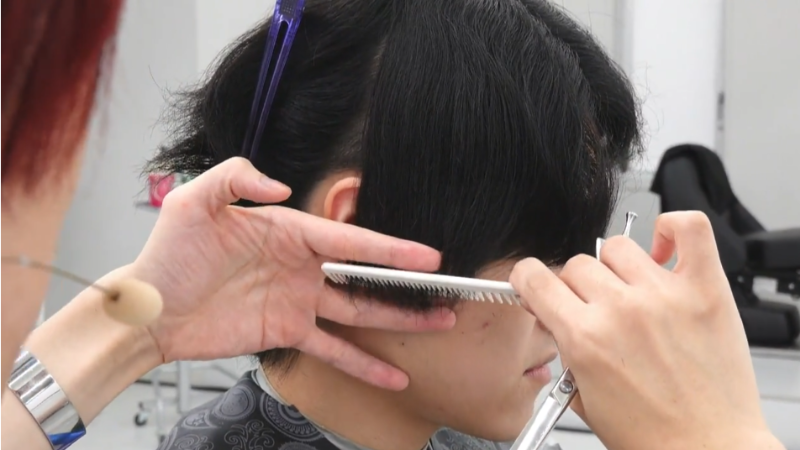 前髪の分け目が固定されない場合は三角形の部分を削っておくと、どこで分けても綺麗なラインに繋がります。